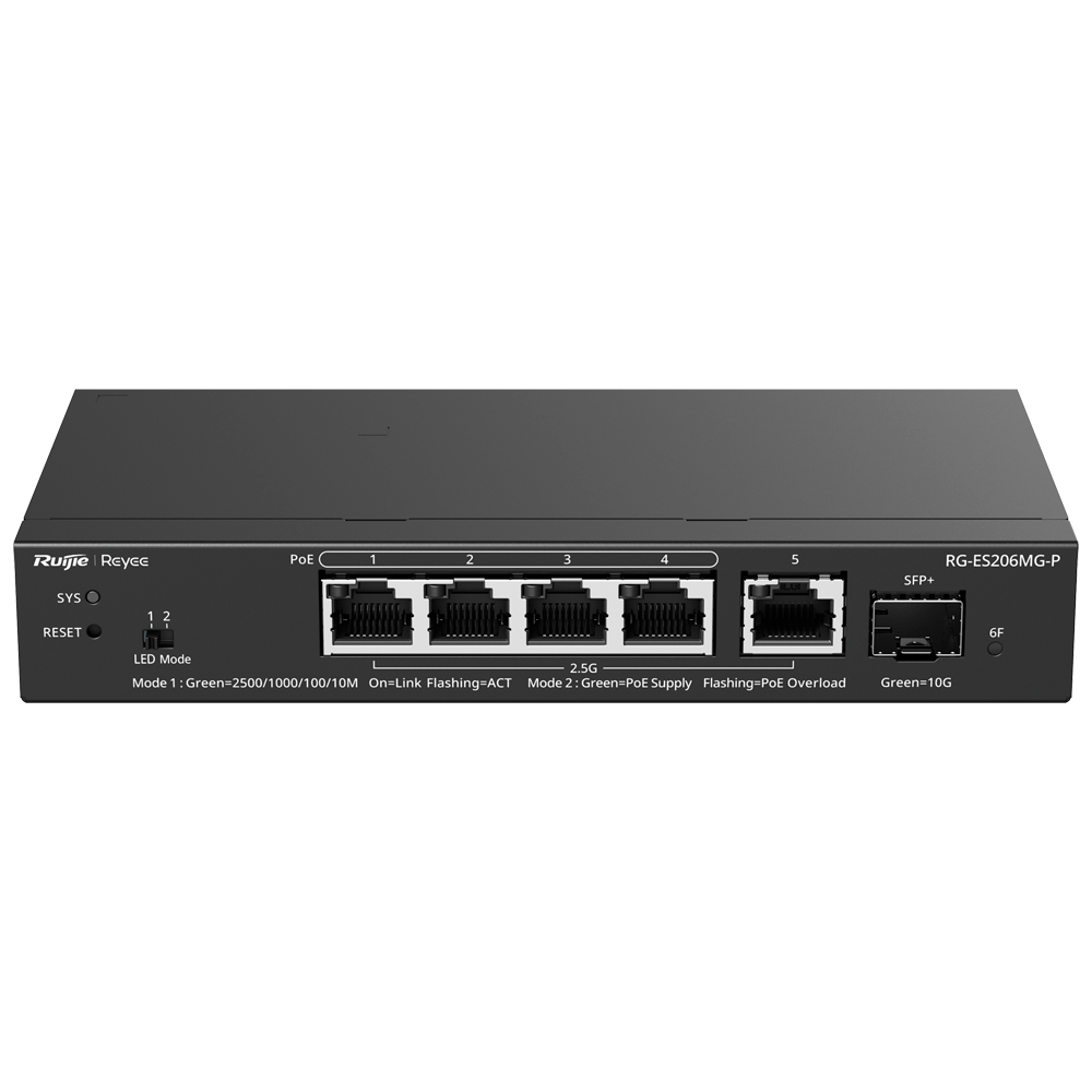 Ruijie Reyees RG-ES206MG-P er en 2-lags, 5-håndterbar switch med 2,5G, multigigabit 1 port, 10GbE 130 802.3af/at SFP+ port og PoE+ på alle porte; leverer op til [%VAR%] samlet W til at strømforsyne IEEE [%VAR%] enheder. Den tilbyder gratis cloud-administration, nem web- og app-konfiguration og er ideel til at udnytte Wi-Fi 7 og maksimere ydeevnen i kontornetværk eller små virksomhedsprojekter. Dens blæserløse design gør den støjsvag, muliggør installation på skrivebord eller væg og har avanceret strømbeskyttelse og funktioner som VLAN, portisolering og DHCP snooping for sikkerhed og effektivitet.