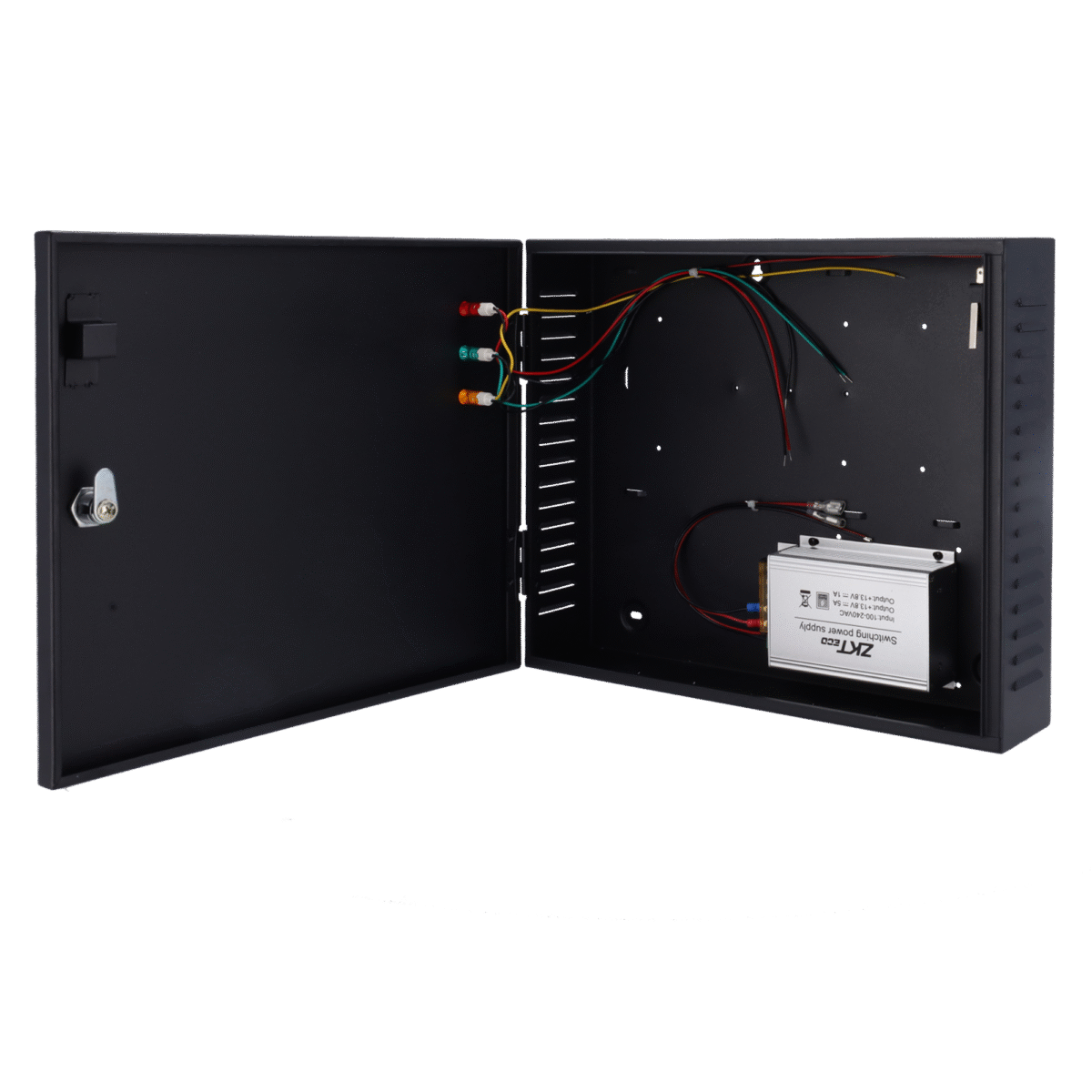 ZKTecoINBIO-seriens adgangskontrolboksSikkerhedslås med nøgleInkluderer strømforsyningPlads til backupbatteriLED-indikatorer